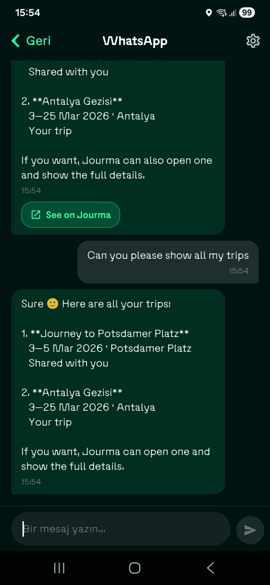 Download Jourma for free. Plan trips, manage everything via WhatsApp, and travel stress-free.