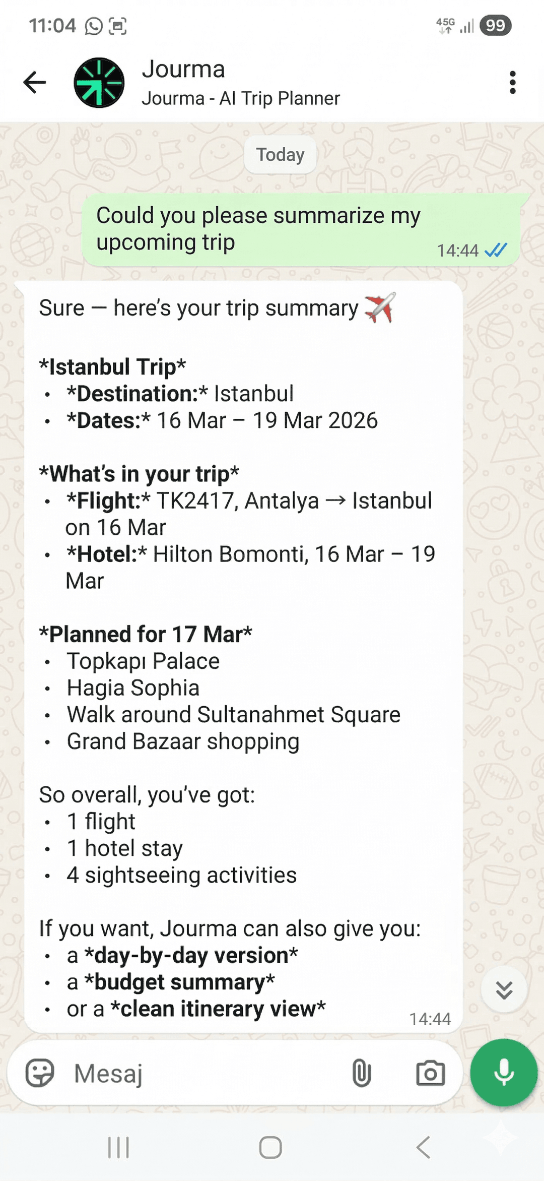 Управляйте поездками прямо в WhatsApp — спрашивайте о маршруте, получайте сводки и оставайтесь в курсе своих планов.